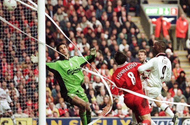 Manchester Uniteds Andy Cole får her nettet til at blafre bag David James i 1997. Foto: Dan Chung/Reuters/Ritzau Scanpix.