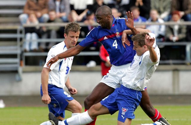 Her er Julian Johnsson i kamp mod Patrick Viera i forbindelse med en VM-kvalifikationskamp i 2004. Foto: Philippe Wojazer/Reuters/Ritzau Scanpix